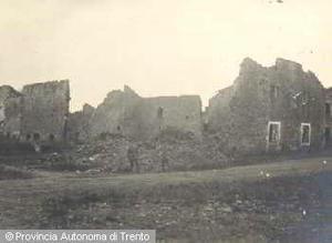 - EDIFICI GRAVEMENTE DANNEGGIATI DAI BOMBARDAMENTI, DUE UOMINI IN DIVISA MILITARE AUSTRIACA TRA LE MACERIE