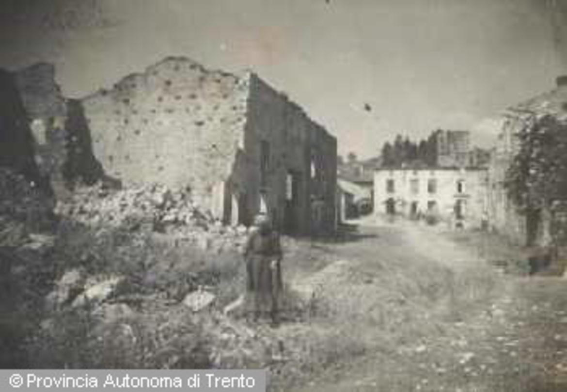 VEDUTA DI UNA VIA DI PAESE, EDIFICI GRAVEMENTE DANNEGGIATI DAI BOMBARDAMENTI, DONNA TRA LE MACERIE