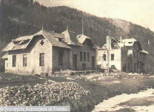 VEDUTA DI DUE EDIFICI GRAVEMENTE DANNEGGIATI DAI BOMBARDAMENTI. 1914-1918