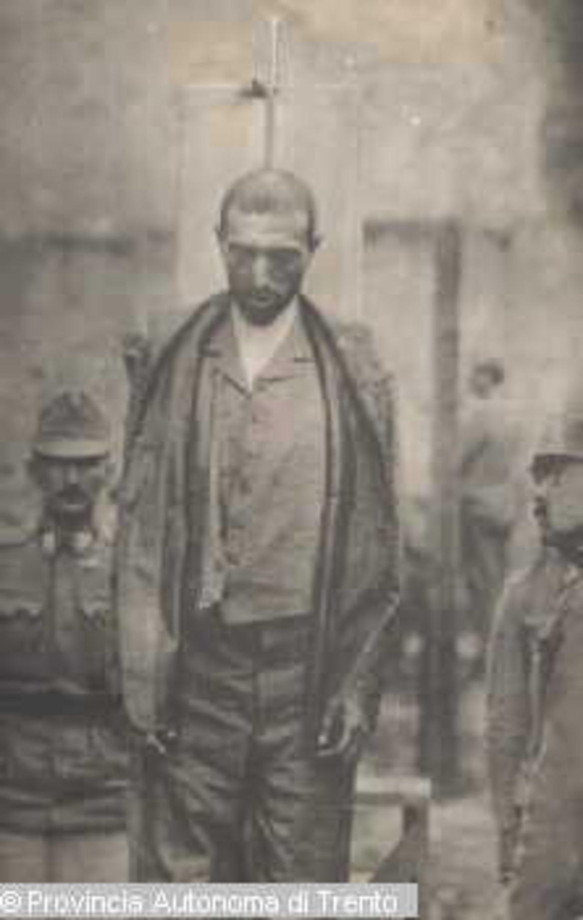 - TRENTO. FOSSA DELLA CERVARA, CASTELLO DEL BUONCONSIGLIO. FABIO FILZI DOPO L'IMPICCAGIONE. 12 LUG. 1916