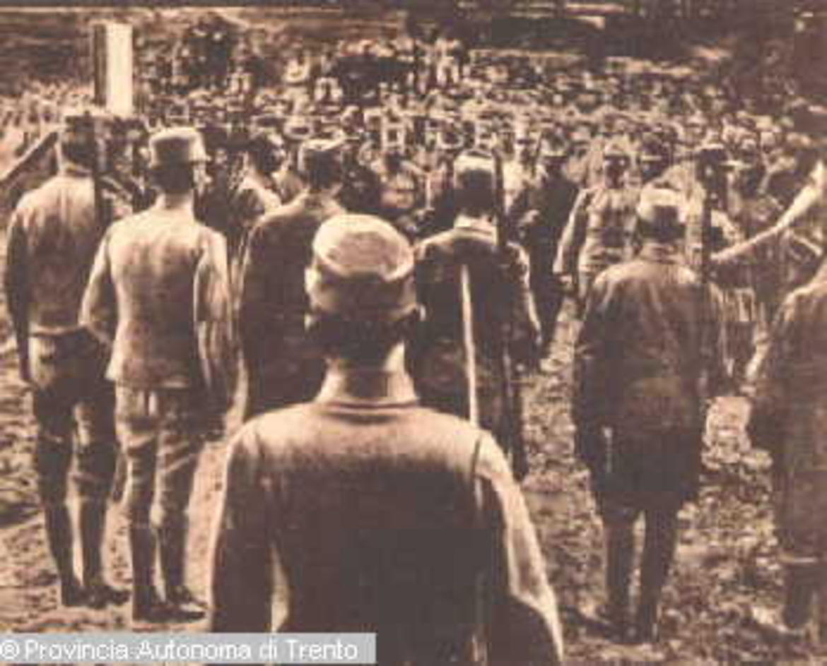 TRENTO. FOSSA DELLA CERVARA, CASTELLO DEL BUONCONSIGLIO. FABIO FILZI ASCOLTA LA LETTURA DELLA SENTENZA. 12 LUG. 1916