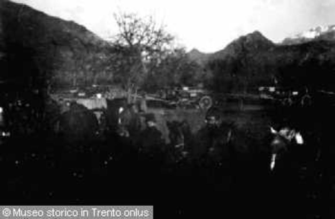 - VALSUGANA, CALDONAZZO (TN). GRUPPO DI MILITARI CON CAVALLI, SULLO SFONDO CARRI. 1916