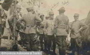 GRUPPO DI UOMINI IN DIVISA MILITARE, SI RICONOSCE GIOVANNI DELAITI DAVANTI AL GEN. LUIGI CADORNA