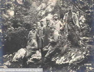 GRUPPO DI UOMINI IN DIVISA MILITARE AUSTRIACA DURANTE UNA SOSTA IN UN BOSCO. 1914-1918
