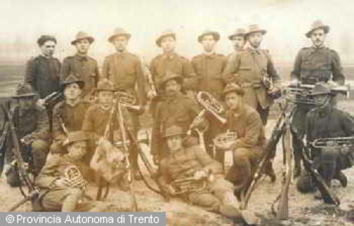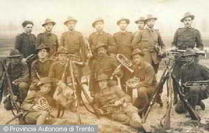 GRUPPO DI MILITARI APPARTENENTI AL BATTAGLIONE NEGROTTO CON TROMBE. 1914-1915