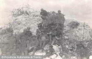 GRUPPO DI UOMINI IN DIVISA MILITARE ITALIANE SU DI UNA CIMA, ATTORNO FILO SPINATO. 1918-1919