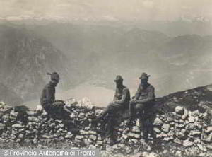 - MONTE BALDO, ALTISSIMO. RITRATTO A FIGURA INTERA DI NINO PERNICI, GIULIO E SILVIO ZANIBONI IN DIVISA MILITARE. LUG. 1915