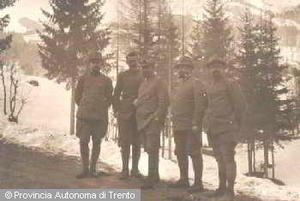 - GRUPPO DI ALPINI, SI RICONOSCONO GUIDO DORNA, FABIO DE ZINIS, FRANCESCO BRIGADOI, GUSTAVO OCHNER, GIOVANNI BATTISTA TRAPPMANN. GEN. 1916