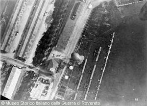 PADOVA - MANIFESTAZIONE AEREA CON S.M. IL RE VITTORIO EMANUELE III [L'AEREOPORTO CON PALLONI FRENATI, AEREI CAPRONI, S.V.A. POMILIO SCHIERATI ALL'AEREOPORTO]