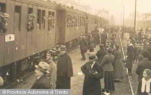 TRENO AFFOLLATO DI MILITARI, IN PARTENZA PER IL FRONTE, PRESSO UNA STAZIONE FERROVIARIA, FOLLA LUNGO I BINARI