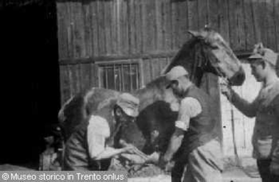 - (UNGHERIA). MILITARI INTENTI A PULIRE GLI ZOCCOLI A UN CAVALLO DAVANTI ALLA STALLA. 1915