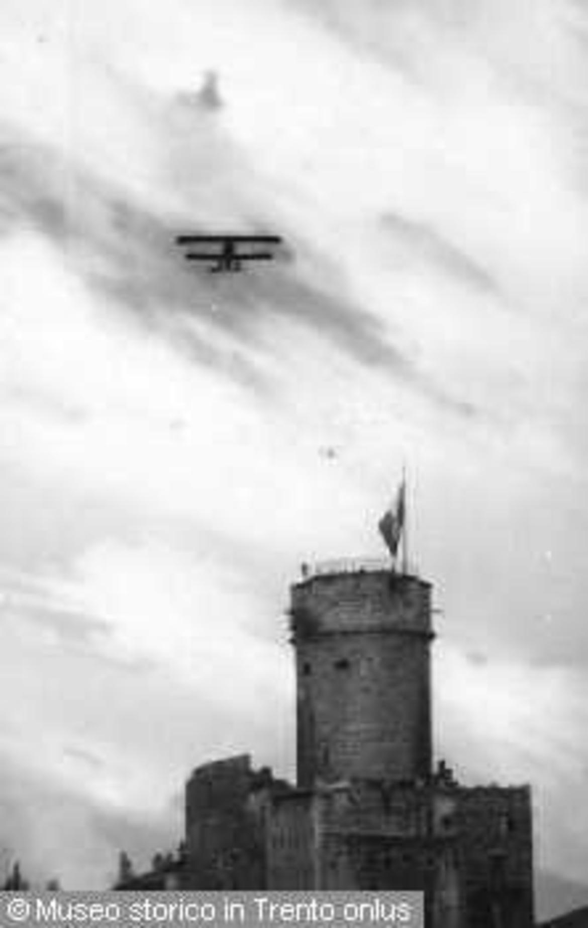 - TRENTO. AEREI SORVOLANO IL CASTELLO DEL BUONCONSIGLIO, IN PRIMO PIANO LA TORRE D'AUGUSTO CON TRICOLORE. 19 GIU. 1921