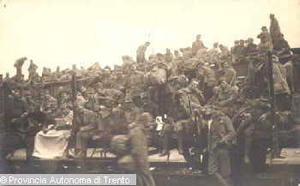 - BOLZANO. TRUPPE AUSTRIACHE IN RITIRATA, TRENO CARICO DI UOMINI IN DIVISA MILITARE. NOV. 1918