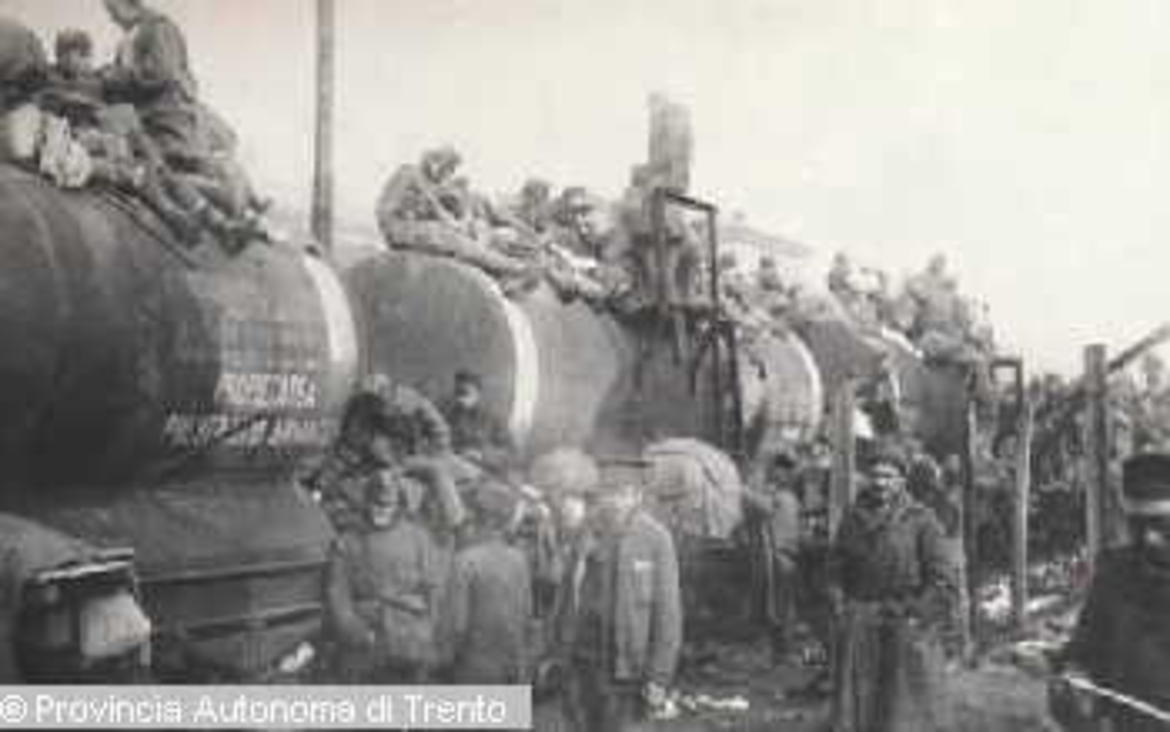 BOLZANO, STAZIONE FERROVIARIA. TRENO MERCI CARICO DI UOMINI IN DIVISA MILITARE AUSTRIACA. NOV. 1918