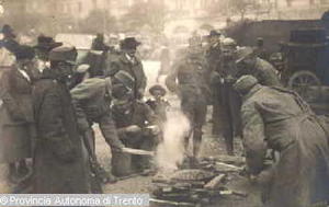 BOLZANO. GRUPPO DI UOMINI IN DIVISA MILITARE AUSTRIACA PREPARANO IL PASTO ALL'APERTO, ATTORNO POPOLAZIONE CIVILE OSSERVA. NOV. 1918