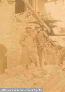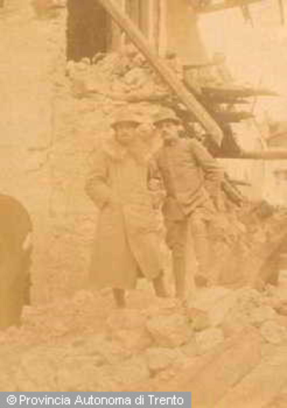 - LOPPIO (MORI, TN). RITRATTO A FIGURA INTERA DI DANTE SCOTONI ED UN COMMILITONE DAVANTI AD UN EDIFICIO GRAVEMENTE DANNEGGIATO