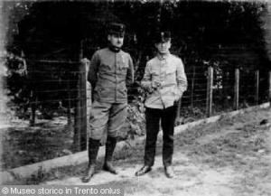 - MUKACËVO (UCRAINA). RITRATTO A FIGURA INTERA DI DUE MILITARI LUNGO UN RETICOLATO. 1917