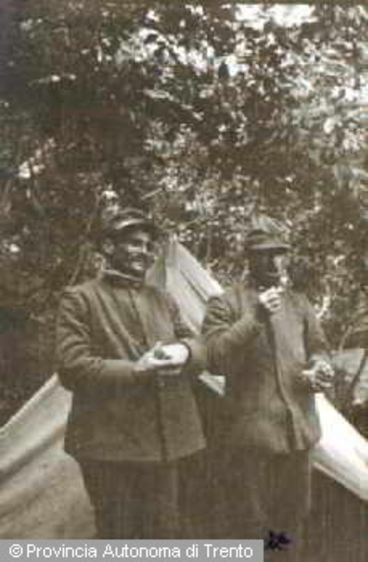 - PICCOLE DOLOMITI. RITRATTO DI DUE UOMINI IN DIVISA MILITARE ITALIANA DAVANTI AD UNA TENDA, SI RICONOSCE PASINI. GIU. 1916