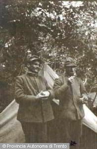 PICCOLE DOLOMITI. RITRATTO DI DUE UOMINI IN DIVISA MILITARE ITALIANA DAVANTI AD UNA TENDA, SI RICONOSCE PASINI. GIU. 1916