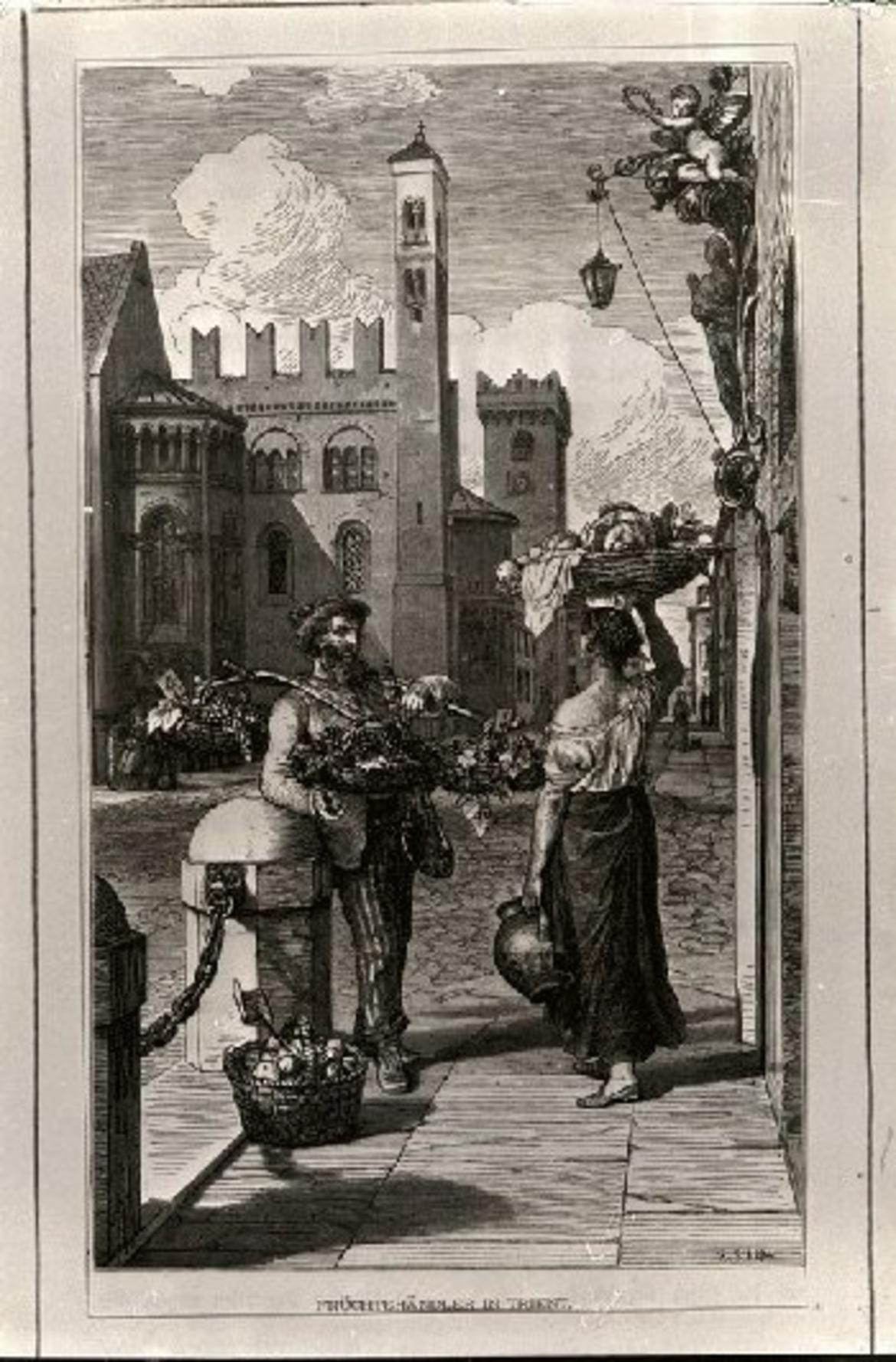 Riproduzione stampa antica raffigurante venditori di frutta presso la Cattedrale