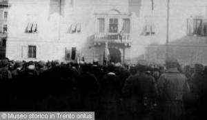 - TRENTO, PIAZZA FIERA. SALUTO DEL VESCOVO CELESTINO ENDRICI ALLA FOLLA DAL BALCONE DI PALAZZO VESCOVILE. 1918 (?)