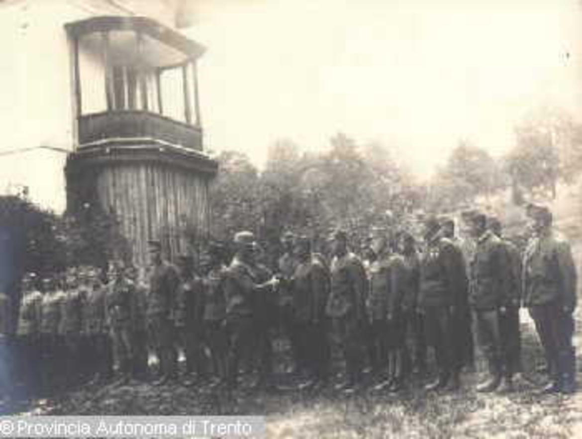 SCHIERAMENTO DI UOMINI IN DIVISA MILITARE IN OCCASIONE DELLA VISITA DI UN UFFICIALE. 1914-1918