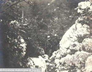 - UOMINI IN DIVISA MILITARE AUSTRIACA PROCEDONO SU UN SENTIERO TRA LE ROCCE. 1914-1918