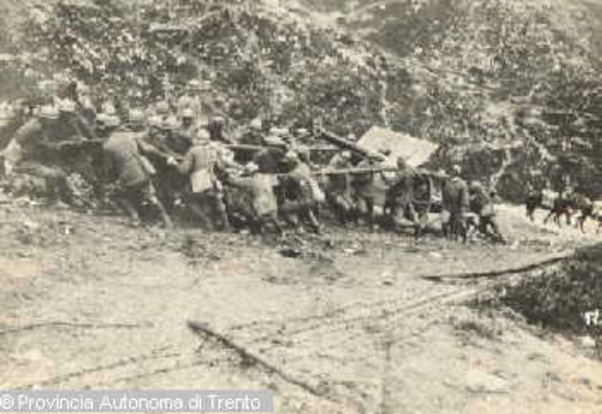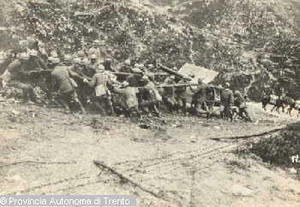SOLDATI ITALIANI MENTRE TRASCINANO CON LE FUNI UN PEZZO D'ARTIGLIERIA PESANTE. 1915-1918