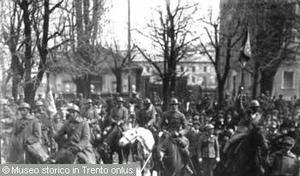 - TRENTO, CORSO TRE NOVEMBRE. CAVALLERIA ITALIANA CON IL DUCA DI PISTOIA DAVANTI ALLA CASA DI CESARE BATTISTI. 3 NOV. 1918