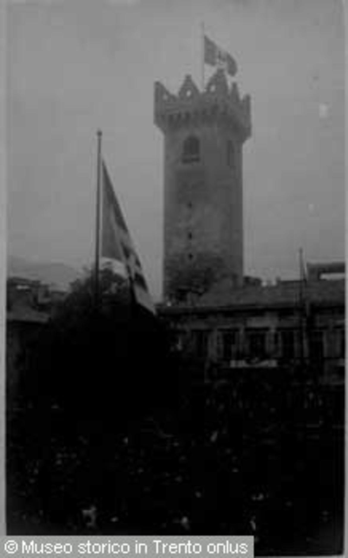 - TRENTO, PIAZZA DUOMO. FOLLA IN OCCASIONE DELLA CERIMONIA PER L'ANNESSIONE DEL TRENTINO ALL'ITALIA. SULLA TORRE CIVICA E NEL CENTRO DELLA PIAZZA BANDIERE ITALIANE. 10 OTT. 1920