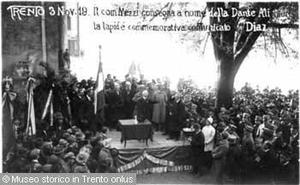 TRENTO 3 NOV. 19. IL COM. MEZZI CONSEGNA A NOME DELLA DANTE ALIGHIERI LA LAPIDE COMMEMORATIVA COMUNICATO UFF. DIAZ