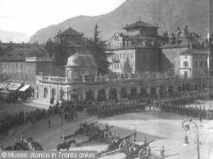 - BOLZANO, PIAZZA WALTHER. VEDUTA DALL'ALTO DELLA PIAZZA CON SPIEGAMENTO DI MEZZI E TRUPPE ITALIANE. NOV. 1918