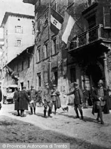 TRENTO, VIA BELENZANI. UOMINI IN DIVISA MILITARE ITALIANA DAVANTI ALL'ENTRATA DI PALAZZO THUN. 1919-1920