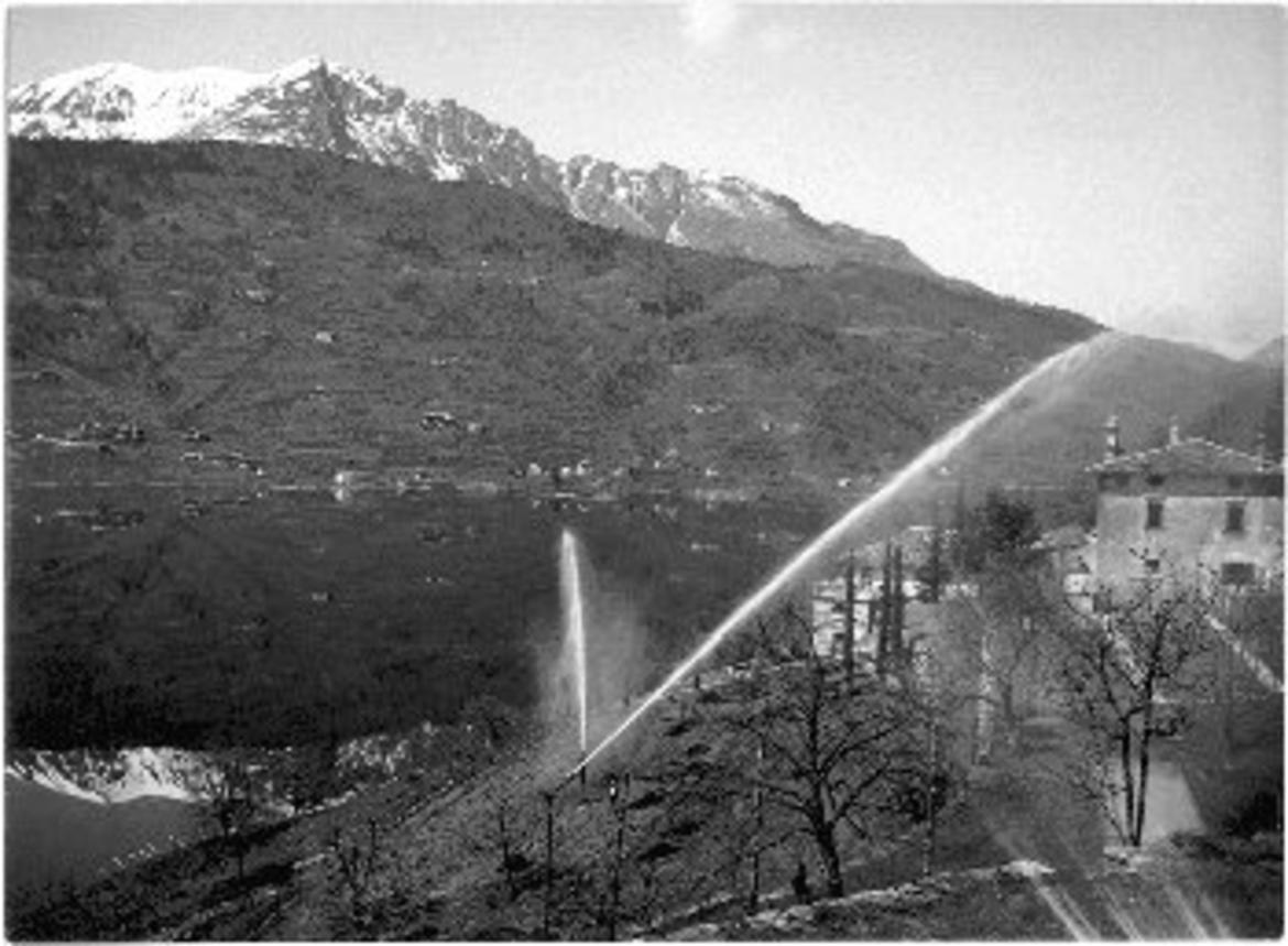 Tenna / Impianti di irrigazione in funzione in località Masi di Campolongo, sullo sfondo del Lago di