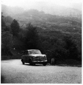 Trento, M. Bondone: automobile concorrente lungo il percorso Trento-Bondone 1956