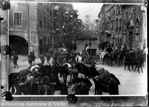 Trento, Piazza duomo - Via Belenzani, arrivo dei militari italiani nel 1918 (riproduzione)