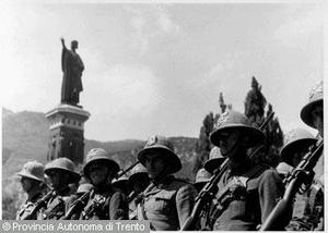 - Trento, piazza Dante / Soldati in parata durante un raduno militare marciano sotto il monumento a Dante