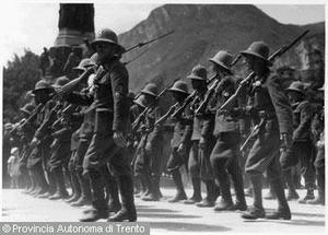 - Trento, piazza Dante / Soldati in parata durante un raduno militare marciano sotto il monumento a Dante