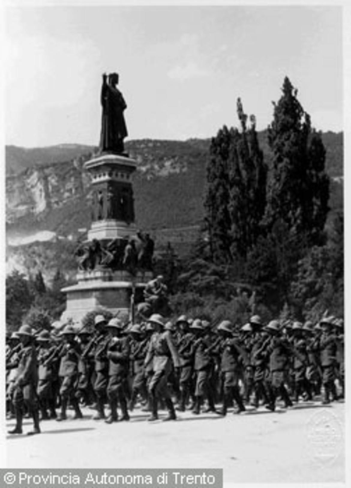 - Trento, piazza Dante / Soldati in parata durante un raduno militare marciano sotto il monumento a Dante