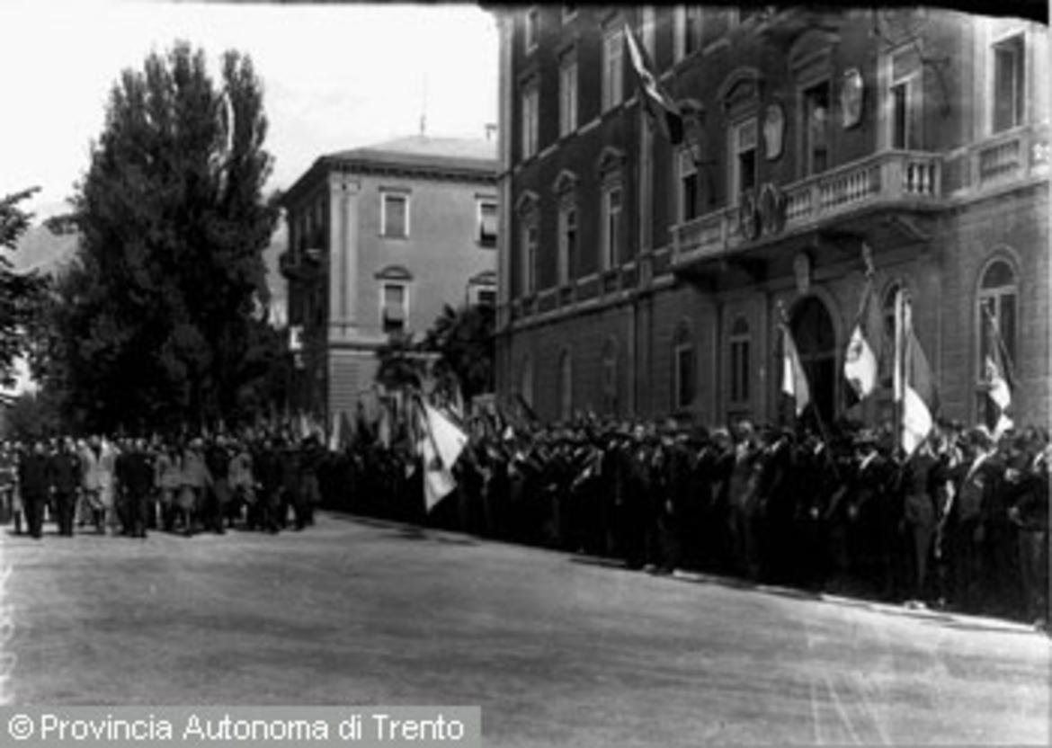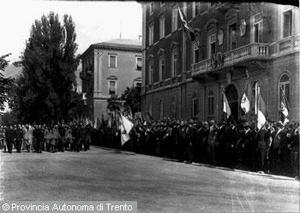 Trento, piazza Dante, sfilata del gerarca Giuriati davanti al palazzo del governo (1931)