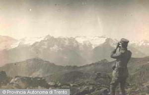 - GRUPPO ADAMELLO PRESANELLA. VEDUTA DELLA CATENA DAL PASSO DEI CONTRABBANDIERI, IN PRIMO PIANO MILITARE CON BINOCOLO. SET. 1915