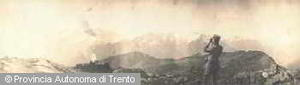 GRUPPO ADAMELLO PRESANELLA. VEDUTA DELLA CATENA DAL PASSO DEI CONTRABBANDIERI, IN PRIMO PIANO MILITARE CON BINOCOLO. SET. 1915