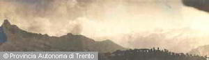 GRUPPO DELLA PRESANELLA E MONTE ALBIOLO. VEDUTA PANORAMICA DAL PASSO DEI CONTRABBANDIERI, IN PRIMO PIANO MILITARI IN TRINCEA. SETT. 1915