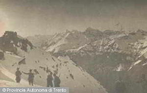 - GRUPPO DELLO STELVIO. VEDUTA PANORAMICA DALLA PUNTA PEDRANZINI, IN PRIMO PIANO GRUPPO DI MILITARI SUGLI SCI. MAG. 1916