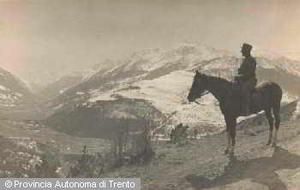 - VALTELLINA, BORMIO (SO). VEDUTA DEL PAESE DALL'ALTO, IN PRIMO PIANO UOMO IN DIVISA MILITARE A CAVALLO