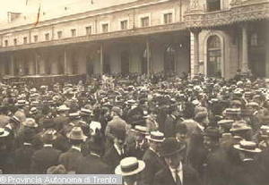 MILANO, STAZIONE FERROVIARIA. FOLLA IN UNA VIA DELLA CITTÀ IN OCCASIONE DI UNA MANIFESTAZIONE INTERVENTISTA. 1914