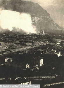 - VALSUGANA. OSPEDALETTO (TN). VEDUTA DEL PAESE MENTRE È IN CORSO UN VIOLENTO INCENDIO. 1915-1918