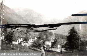 VALLARSA (?). VEDUTA DI UN PAESE, IN PRIMO PIANO UOMO IN DIVISA MILITARE. 1916-1918