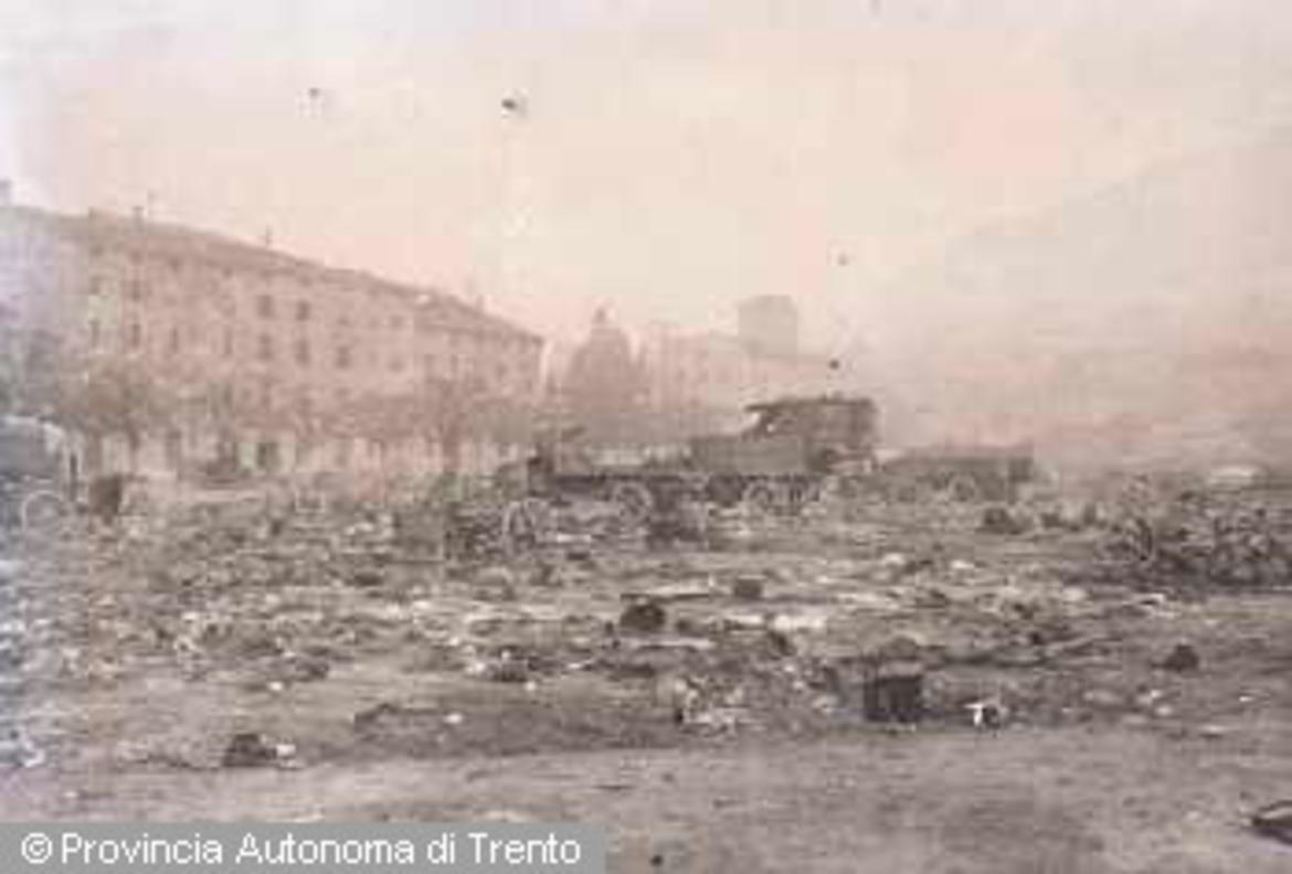 - TRENTO, PIAZZA VENEZIA. VEDUTA DELLA PIAZZA RIDOTTA A UN CUMULO DI RIFIUTI DOPO LA RESA DELL'ESERCITO AUSTRIACO. NOV. 1918