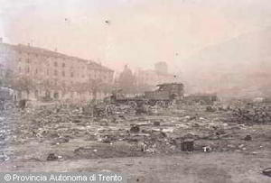 TRENTO, PIAZZA VENEZIA. VEDUTA DELLA PIAZZA RIDOTTA A UN CUMULO DI RIFIUTI DOPO LA RESA DELL'ESERCITO AUSTRIACO. NOV. 1918
